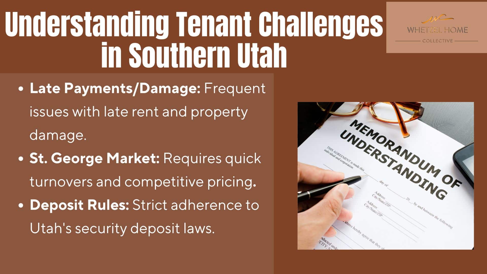 Southern Utah’s rental market has its own set of challenges. At Whetzel Homes Collective, we’ve learned a lot about these issues. We’ve worked directly with property owners in Washington County and St. George.